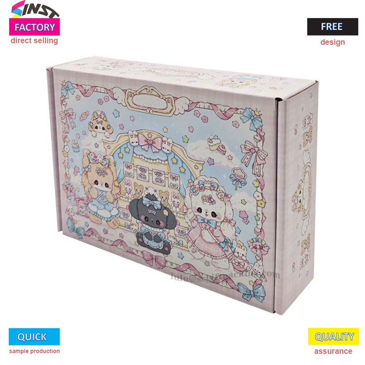 துணிகளுக்கான வண்ணமயமான நெளி காகித விமானப் பெட்டியில் வெளிர் நீல உச்சரிப்புகளுடன் இனிப்பு இளஞ்சிவப்பு வண்ணத் திட்டம் உள்ளது. பெட்டியில் மலர் மாலைகள், சிறிய விலங்குகள், வில், மேகங்கள் மற்றும் இதயங்கள் போன்ற கார்ட்டூன் கூறுகளால் நிரம்பியுள்ளது, இது ஒரு கனவான மற்றும் அழகான பாணியை உருவாக்குகிறது. தோற்றத்திலிருந்து சேவை வரை, இது ஆடை பேக்கேஜிங்கை முழுமையாக மேம்படுத்துகிறது மற்றும் பிராண்ட் முறையீட்டை மேம்படுத்துகிறது.