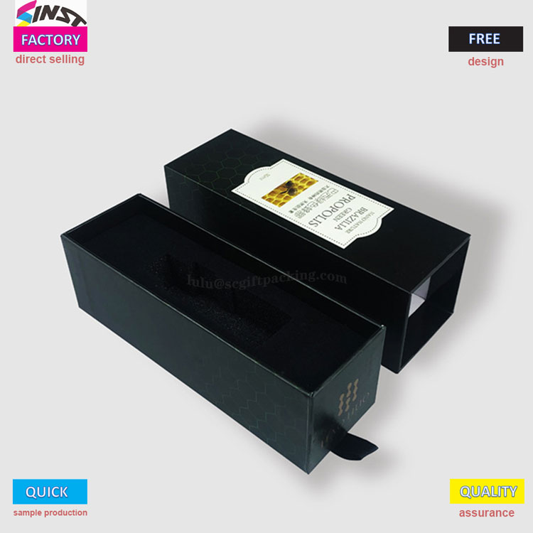 அத்தியாவசிய எண்ணெய்க்கான இந்த சொகுசு கடுமையான டிராயர் நெகிழ் பரிசு பெட்டி பேக்கேஜிங் ஒரு பகுப்பாய்வு செய்யப்பட்ட வடிவமைப்பு மற்றும் வெளிப்படையான சாளரங்களைக் கொண்டுள்ளது, இது மூடியைத் திறக்க வேண்டிய அவசியமின்றி பெட்டியின் உள்ளே உள்ள நான்கு பெட்டிகளின் தெளிவான தெரிவுநிலையை அனுமதிக்கிறது; கருப்பு மற்றும் இளஞ்சிவப்பு இரட்டை பெட்டிகளை அருகருகே வைக்கும்போது, வடிவமைப்பின் புத்தி கூர்மை காணப்படலாம்: கருப்பு பெட்டியில் உடலில் தங்க எழுத்துக்கள் மிகவும் கடினமான தோற்றத்திற்காக அழகுபடுத்தப்பட்டுள்ளன, மேலும் பக்கத்தில் உள்ள கருப்பு இழுத்தல் வளையத்தை எளிதில் திறந்து இழுக்க முடியும்; பிங்க் மாடல் ஒரு வெளிப்படையான சாளரத்தைத் தக்க வைத்துக் கொண்டுள்ளது, இது எசென்ஸ் மாதிரிக்கான சிறப்பு தொட்டியை நேரடியாகக் காணலாம் - லோஷன் சோதனை, 10 மிலி சாரம் இறுக்கமாக மூடப்பட்டிருக்கும். எசென்ஸ் மாதிரிகள் முதல் கருவிகள் வரை, பிரிவு தெளிவானது மற்றும் கலக்கப்படாதது.