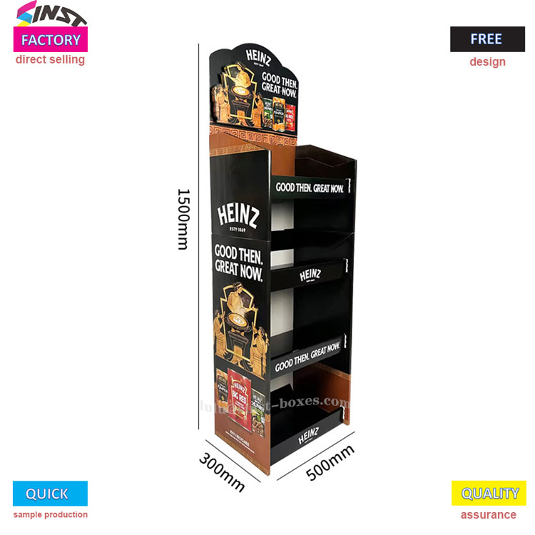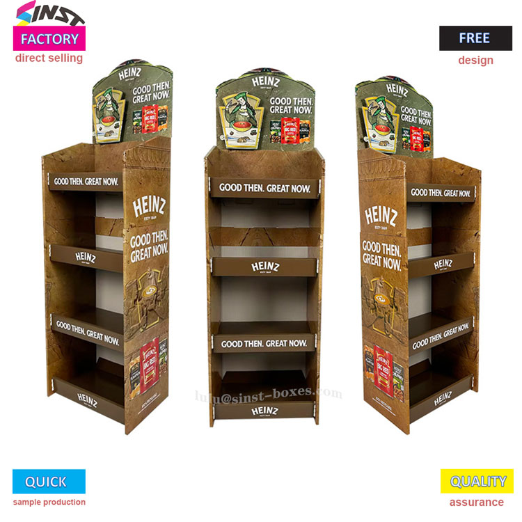 இந்த தக்காளி சாஸ் டிஸ்ப்ளே ரேக் என்பது பல்பொருள் அங்காடிகள் மற்றும் கன்வீனியன்ஸ் ஸ்டோர்களில் சாஸைக் காட்டுவதற்கு "சிறிய உதவியாளர்" ஆகும். இது ஒரு வகை சாஸ் டிஸ்ப்ளே ரேக்கைச் சேர்ந்தது, இது அட்டை காகித டிஸ்ப்ளே ரேக்கால் ஆனது, இது இலகுரக மற்றும் எடுத்துச் செல்ல எளிதானது. அதை பிரித்து கவுண்டரில் வைத்தவுடன் பயன்படுத்தலாம். அலமாரி நான்கு அடுக்குகளாகப் பிரிக்கப்பட்டுள்ளது, ஒவ்வொரு அடுக்கிலும் இரண்டு வரிசைகளில் தக்காளி சாஸ் பாட்டில்கள் இருக்கலாம், மேலும் சில சாலட் டிரஸ்ஸிங் மற்றும் இனிப்பு மற்றும் காரமான சாஸ் ஆகியவையும் இருக்கலாம் - இது "தக்காளி சாஸ் டிஸ்ப்ளே ஷெல்ஃப்" என்று அழைக்கப்படுகிறது, ஆனால் அதை சாஸ் அலமாரியாகவும் பயன்படுத்தலாம். ஒரு சிறிய பல்பொருள் அங்காடியின் சுவையூட்டும் பகுதியில் வைக்க இது பொருத்தமானது.